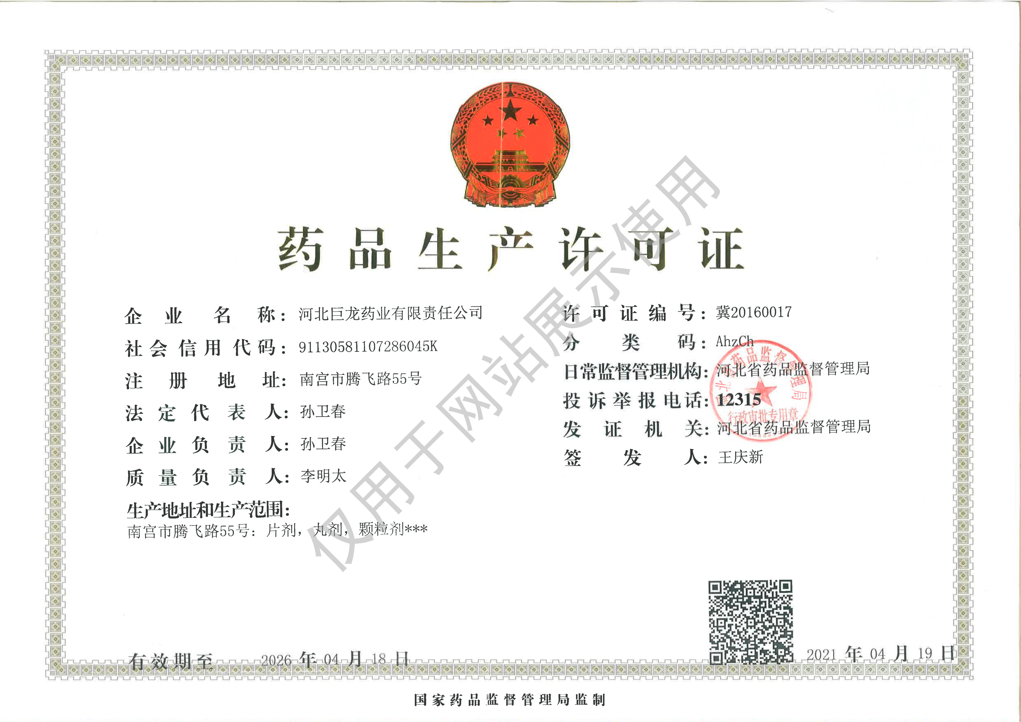河北巨龍藥業有限責任公司,位于南宮市東部工業聚集區,是一家集生產、銷售、科研為一體的中、西藥品生產企業;是河北省醫藥行業協會主席團企業、省高新技術產業化示范企業、省誠信企業、省高新技術產業協會理事、省著名商標企業,南宮市的一家藥品生產企業。其前身南宮市制藥廠,1973年建成并投產,1996年依法破產,1999年改制重建成股份制企業。2005年由河北鑫春建筑建材有限責任公司整體買斷收購,其后陸續注入資金2000多萬元,開發并上市了原國家中藥四類新藥(獨家品種)小兒清肺顆粒,被認定為省高新技術產業化示范基地。2015年企業通過新版藥品GMP認證。